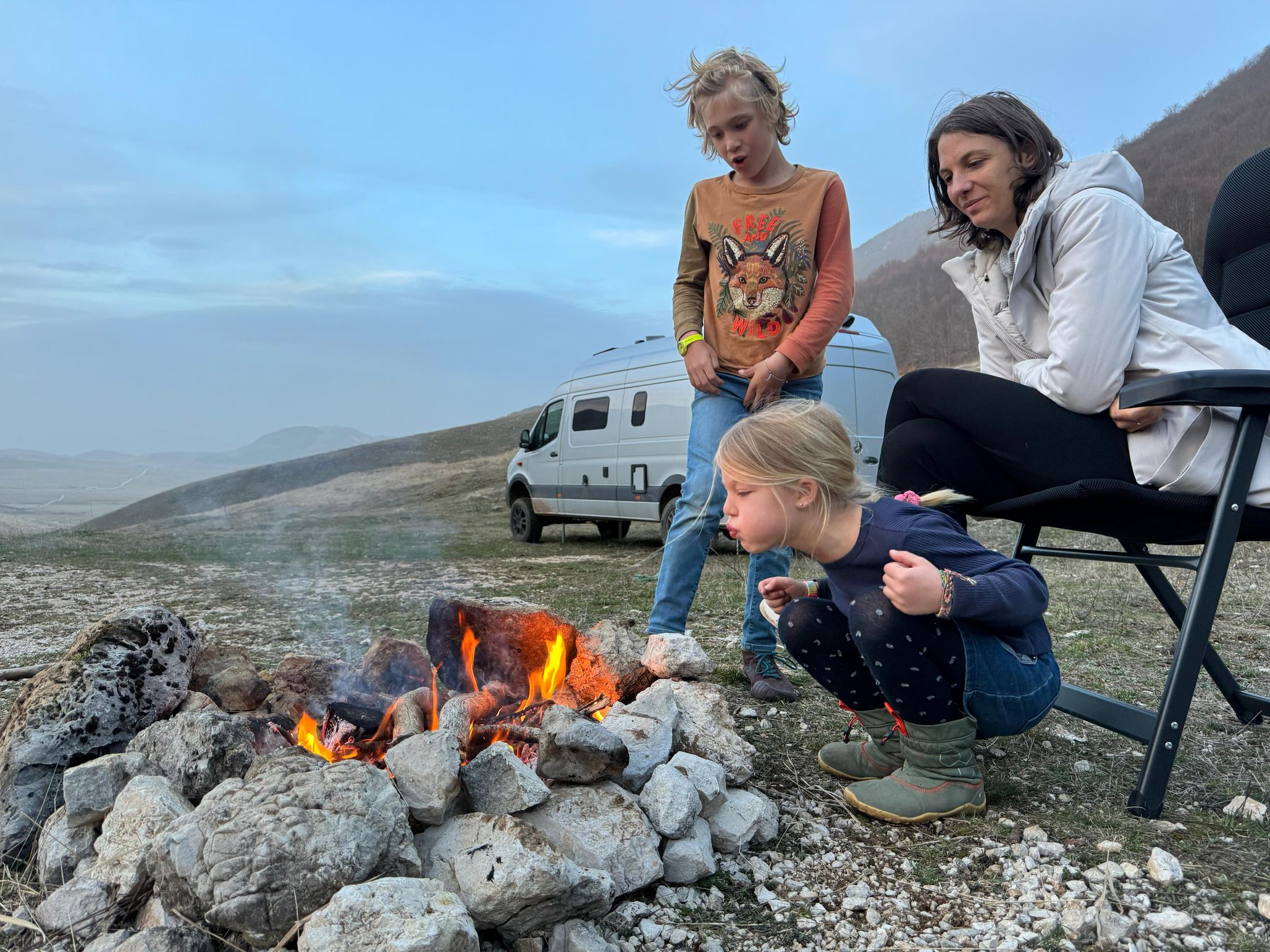 Ho scritto questo post un anno fa, in occasione dell'uscita della guida online Esplorare la paura e ho poi dimenticato di pubblicarlo. Mi è tornato in mente durante la nostra permanenza di qualche giorno sulle montagne abruzzesi, quando con Oliver e Emily abbiamo fatto di nuovo un falò (alcuni contadini ci hanno fatto vedere un posto dove farlo in sicurezza). In quell'occasione abbiamo rivisto con emozione le foto del nostro primo falò… come erano piccini! Vi lascio una foto di quest'ultima esperienza.