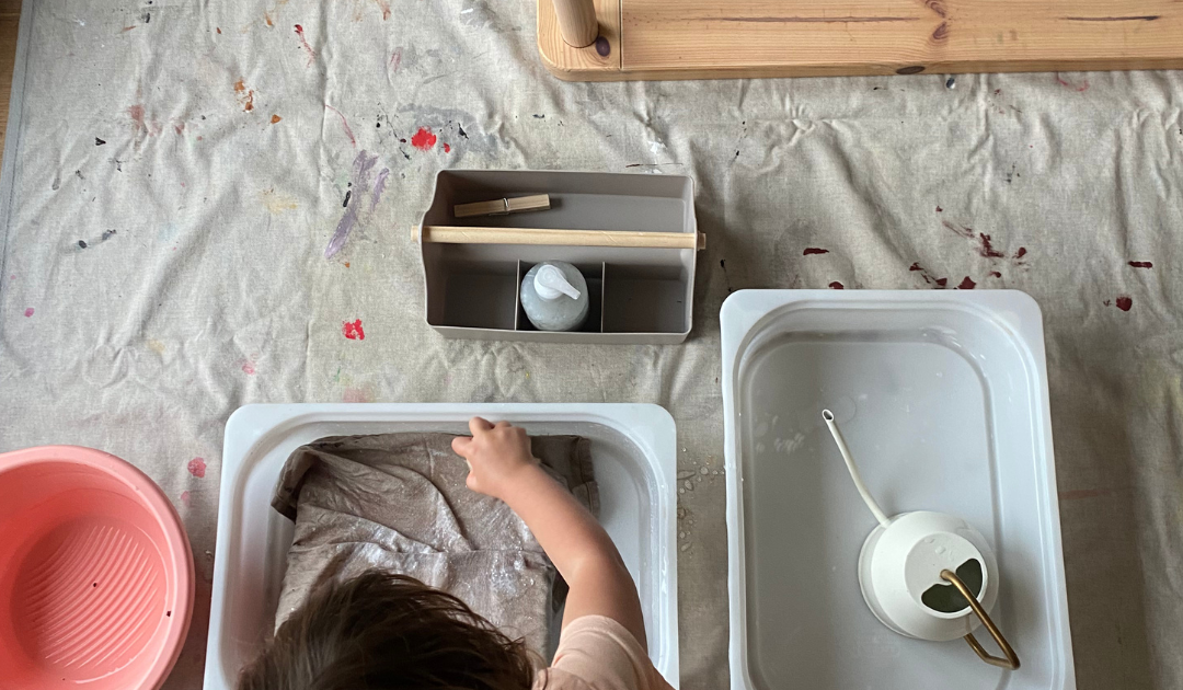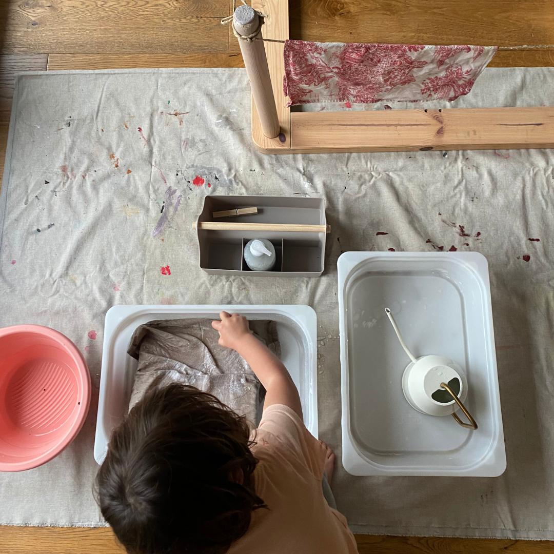 Metti a disposizione di tuǝ figliǝ tovaglioli sporchi di marmellata, un lavatoio e uno stendino fai da te, sono pochi elementi che garantiscono di avere un chiaro riscontro del proprio lavoro: i tovaglioli puliti e stesi. Età: dai 24 mesi circa.