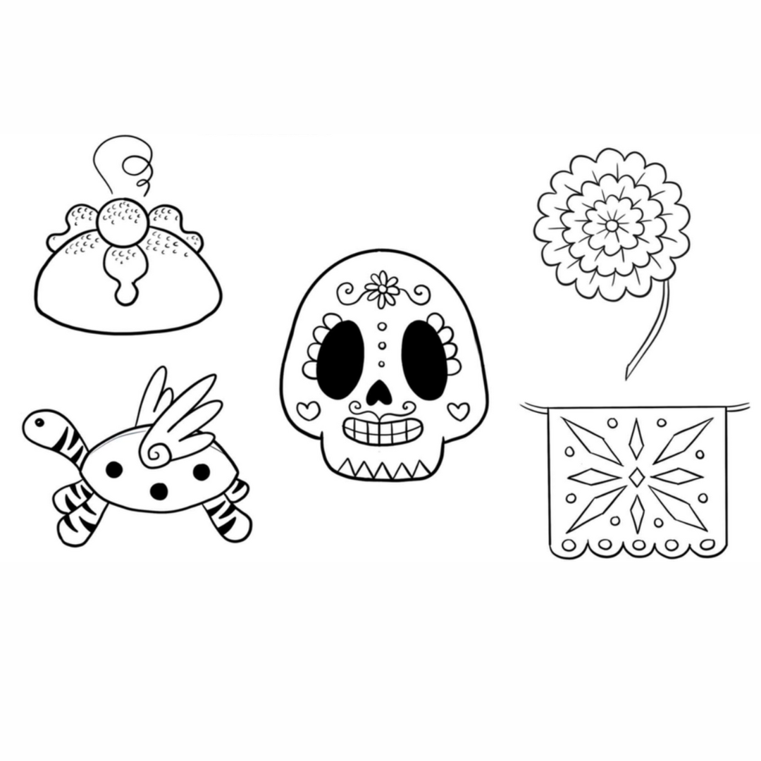 Disegniamo insieme 5 elementi del Dìa de los Muertos: una Calavera, un Pan de muerto, il Cempasuchil, il Papel picado e un Alebrije.